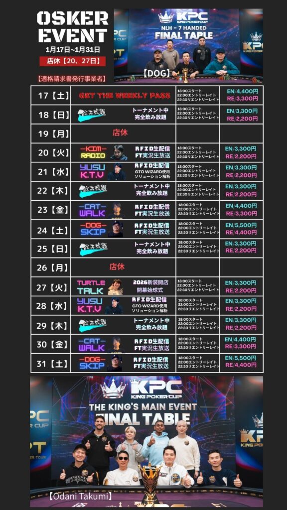 About The AuthorPoker House OskerオーナーDOG&CAT渋谷に誕生したPOKER HOUSE OSKERです!トーナメント、リングゲームを楽しみましょう!Follow :Recent Articles Of This Author2026年1月3日New topics明けましておめでとうございます!2026年の営業再開は1月4日からとなります!本年も様々なイベントでお...2025年12月18日New topics2025年も皆様大変お世話になりました!残す所後半月という事になりましたが、イベント含め皆様に楽しんで...2025年12月2日New topics12月START!今年最後の月はイベント超目白押し! 1年で一番盛りあがる最高の誕生日会が12月6日に...2025年11月15日New topics11月も後半戦となります!そして来週はついにOSKERの8周年イベント開幕!つきましては皆様に楽しんで...2025年11月11日New topics11月でございます!今月の当店は更なるPOWER UP!平日の実況放送M.Cが追加!【火曜KAME、水...2025年10月15日New topics10月後半戦スケジュールが確定!直近の金曜日は各方面でご活躍されておりますお客様との合同イベント!現代...DOG&CATの記事一覧