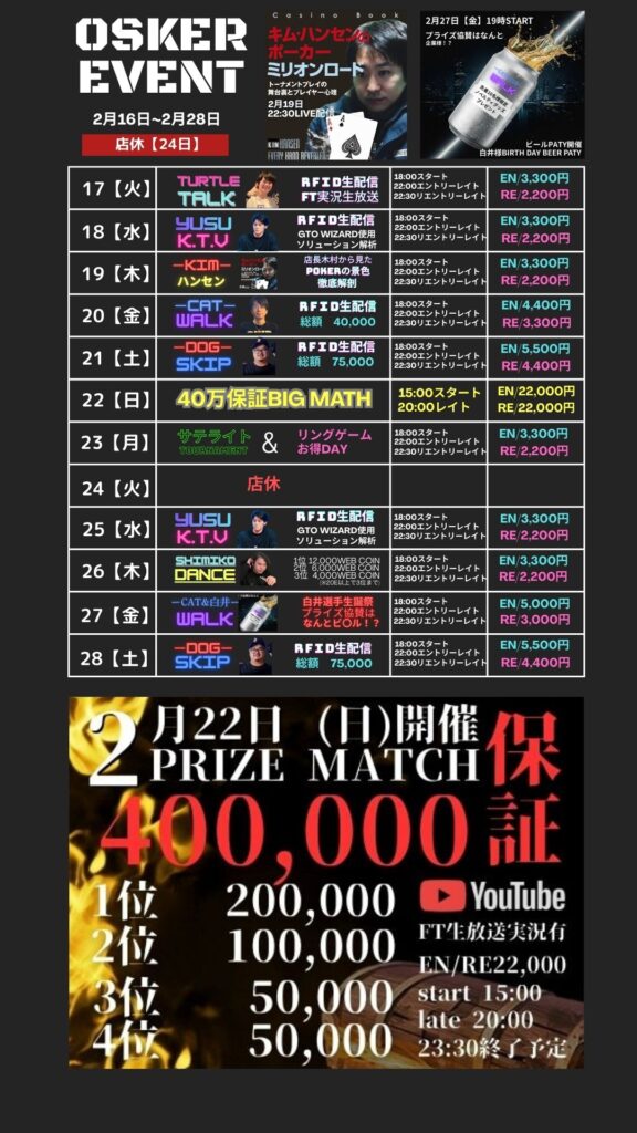 About The AuthorPoker House OskerオーナーDOG&CAT渋谷に誕生したPOKER HOUSE OSKERです!トーナメント、リングゲームを楽しみましょう!Follow :Recent Articles Of This Author2026年4月1日New topics4月開幕致しました!前半のスケジュールになります! 当店は喫煙室とポーカールームが分かれておりますがC...2026年2月28日New topics3月のOSKERはRORD TO JEJUシリーズが始まります! ・入賞でREDDRAGON済州にご招...2026年2月2日New topics2月突入でございます!14日には円山町に名〇偵が!?二人の誕生日もお見逃しなく!2月前半戦いきます!2026年1月17日New topics1月後半スケジュール!そして【朗報】でございますがなんと現在済州で行われているKPCポーカー大会でたく...2026年1月3日New topics明けましておめでとうございます!2026年の営業再開は1月4日からとなります!本年も様々なイベントでお...2025年12月18日New topics2025年も皆様大変お世話になりました!残す所後半月という事になりましたが、イベント含め皆様に楽しんで...DOG&CATの記事一覧
